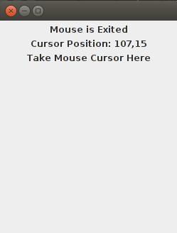 import javax.swing.*; import java.awt.*; import java.awt.event.*; public class SwingMouseListener { public static void main(String args[]) { Abc obj=new Abc(); } } class Abc extends JFrame implements MouseListener { JLabel l1,l2,l3; public Abc() { setLayout(new FlowLayout()); l1=new JLabel("Mouse Action"); l2=new JLabel("Mouse Cursor Position:"); l3=new JLabel("Take Mouse Cursor Here"); add(l1); add(l2); add(l3); l3.addMouseListener(this); setVisible(true); setSize(250,300); setDefaultCloseOperation(JFrame.EXIT_ON_CLOSE); } public void mousePressed(MouseEvent ae) { int x=ae.getX(); int y=ae.getY(); l1.setText("Mouse is Pressed"); l2.setText("Cursor Position: "+x+","+y); } public void mouseReleased(MouseEvent ae) { int x=ae.getX(); int y=ae.getY(); l1.setText("Mouse is Released"); l2.setText("Cursor Position: "+x+","+y); } public void mouseClicked(MouseEvent ae) { int x=ae.getX(); int y=ae.getY(); l1.setText("Mouse is Clicked"); l2.setText("Cursor Position: "+x+","+y); } public void mouseEntered(MouseEvent ae) { int x=ae.getX(); int y=ae.getY(); l1.setText("Mouse is Entered"); l2.setText("Cursor Position: "+x+","+y); } public void mouseExited(MouseEvent ae) { int x=ae.getX(); int y=ae.getY(); l1.setText("Mouse is Exited"); l2.setText("Cursor Position: "+x+","+y); } } |