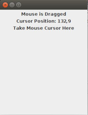 import javax.swing.*; import java.awt.*; import java.awt.event.*; public class SwingMouseMotionListener { public static void main(String args[]) { Abc obj=new Abc(); } } class Abc extends JFrame implements MouseMotionListener { JLabel l1,l2,l3; public Abc() { setLayout(new FlowLayout()); l1=new JLabel("Mouse Action"); l2=new JLabel("Mouse Cursor Position:"); l3=new JLabel("Take Mouse Cursor Here"); add(l1); add(l2); add(l3); l3.addMouseMotionListener(this); setVisible(true); setSize(250,300); setDefaultCloseOperation(JFrame.EXIT_ON_CLOSE); } public void mouseDragged(MouseEvent ae) { int x=ae.getX(); int y=ae.getY(); l1.setText("Mouse is Dragged"); l2.setText("Cursor Position: "+x+","+y); } public void mouseMoved(MouseEvent ae) { int x=ae.getX(); int y=ae.getY(); l1.setText("Mouse is Moved"); l2.setText("Cursor Position: "+x+","+y); } } |
